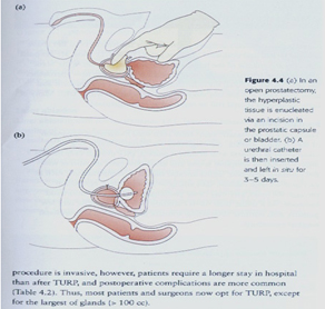 Açık prostatektomi en eski cerrahi tekniktir. %7-14 kan transfüzyonu gerekebilir. Hastanede 5-10 gün kalınmaktadır. Uzun dönem komplikasyon olarak idrar kaçırma, mesane boynu darlığı ve üretra darlığı görülebilir. Açık prostatektomi en invaziv fakat aynı zamanda en etkin ve uzun süreli etkinliği devam eden tekniktir. Sadece Holmium lazer ile enükleasyon (HoLEP) benzer sonuçları daha az morbidite ile sağlamaktadır. HoLEP yapılamıyorsa 80 gr’ dan büyük prostatlarda cerrahi tedavi seçeneğidir.